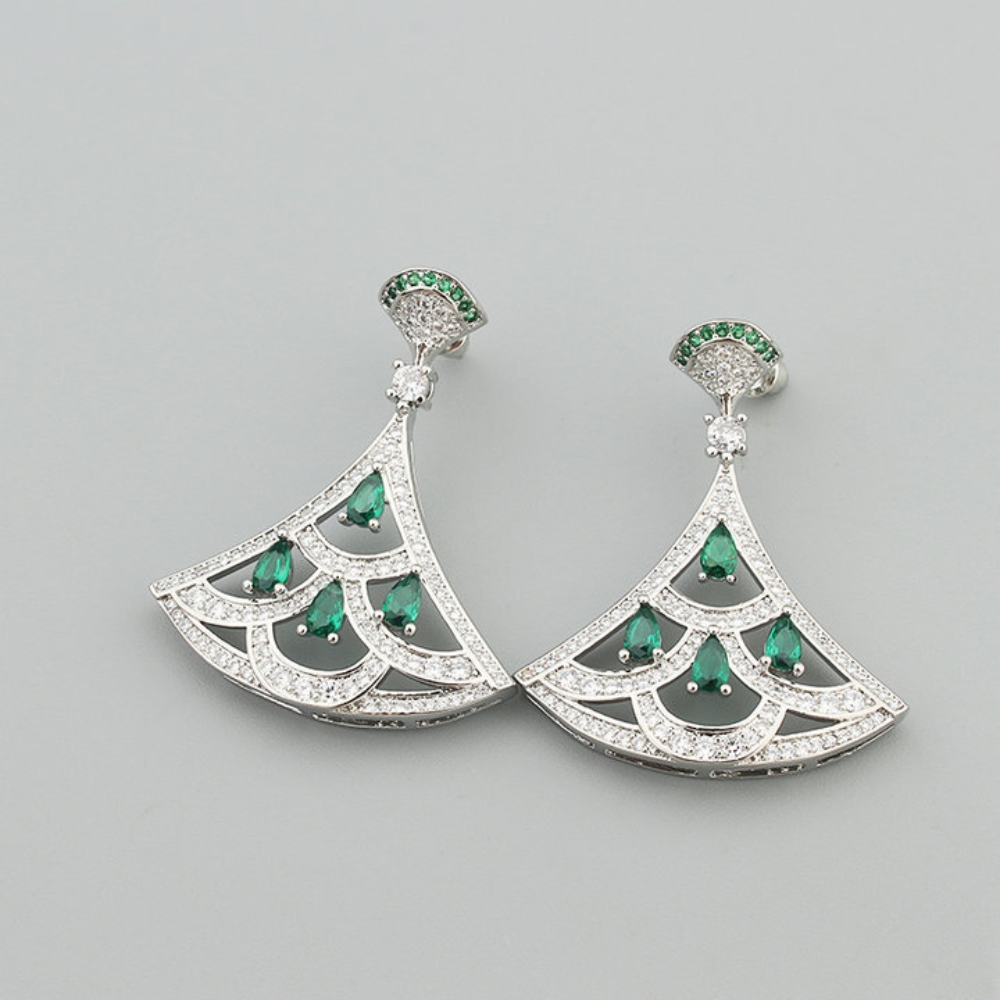 These are luxury fan-shaped earrings. The geometric openwork design is framed add a striking contrast and elegance. The top stud portion is also embellished with green stones, enhancing the overall sophistication and artistic appeal.