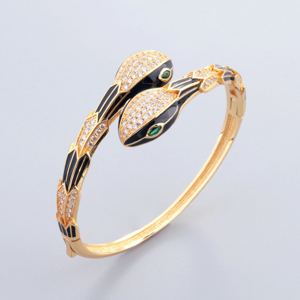 It features the signature double-headed snake design, symbolizing seduction and rebirth. The bracelet is crafted in yellow gold with black enamel detailing, pavé-set diamonds, and green gemstone eyes. It’s an iconic high-jewelry piece that embodies Bvlgari’s luxurious and bold aesthetic.