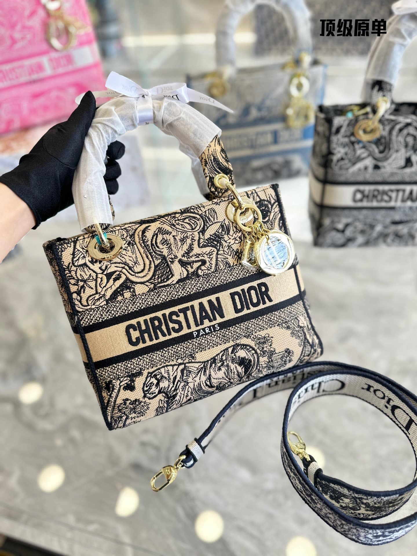 Dior Lady D Lite Bag Brown Toile De Jouy Embroidery / 24Cm