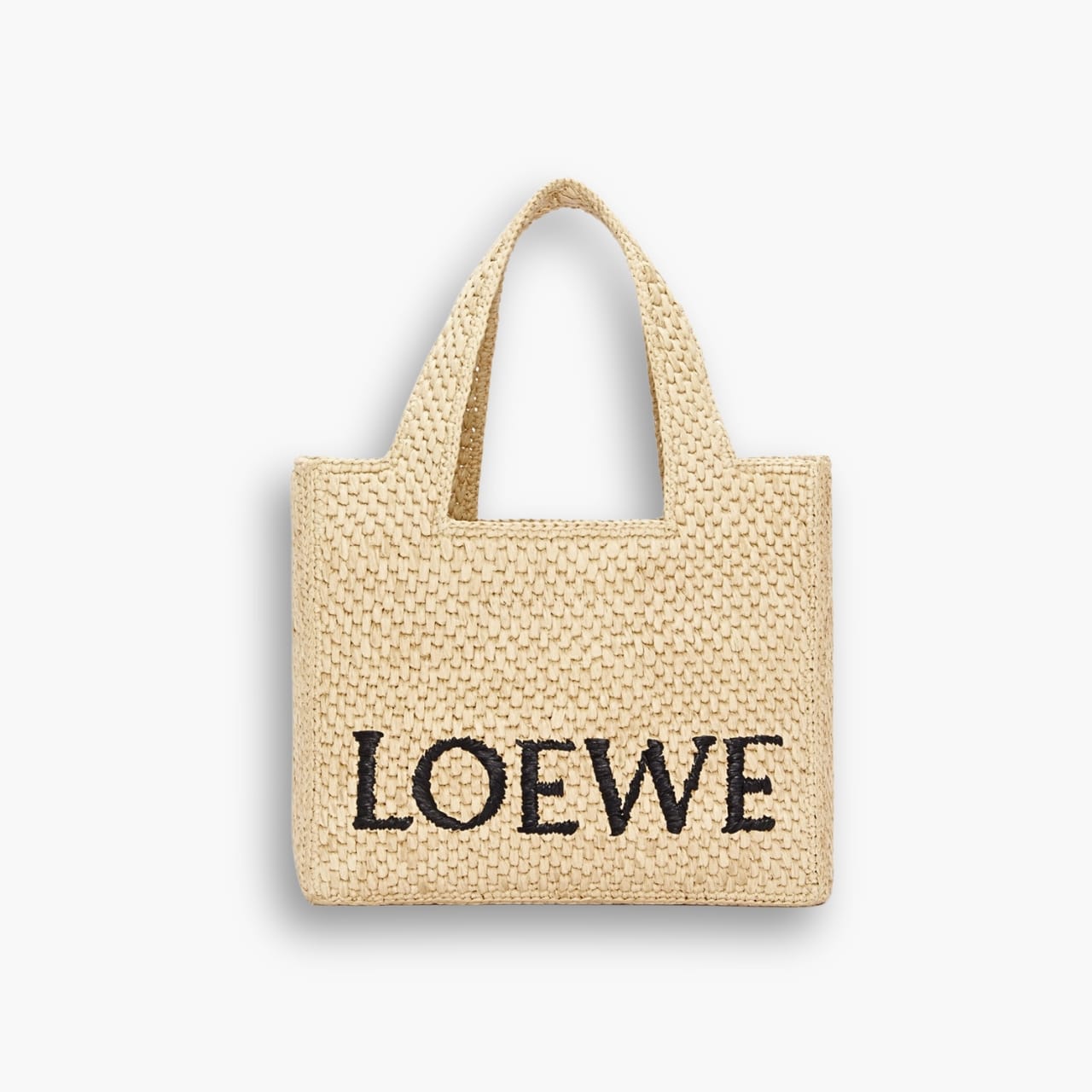 The LOEWE Font Tote is a cuboid bag adorned with a contrasting LOEWE signature. This small version using raffia leaves that have been cultivated, harvested, sun-dried and handwoven.