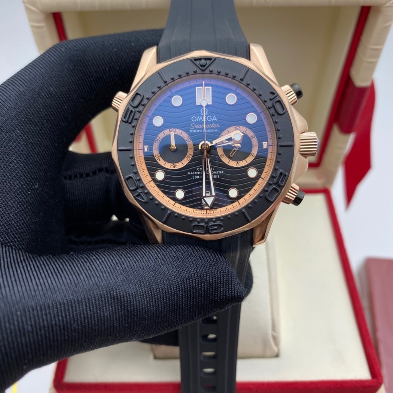 The Omega Seamaster Diver 300M 45mm in black features a black dial with a signature wave pattern, chronograph sub-dials, and a date window at 6 o’clock. Paired with a black rubber strap, it offers both diving functionality and refined style.