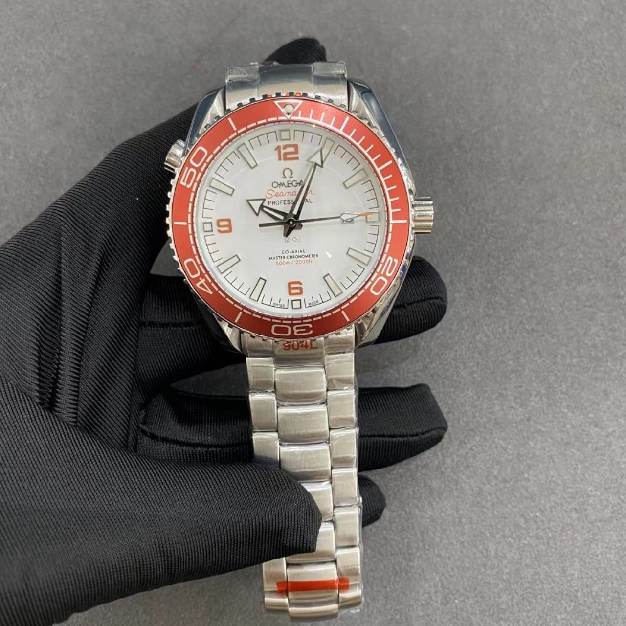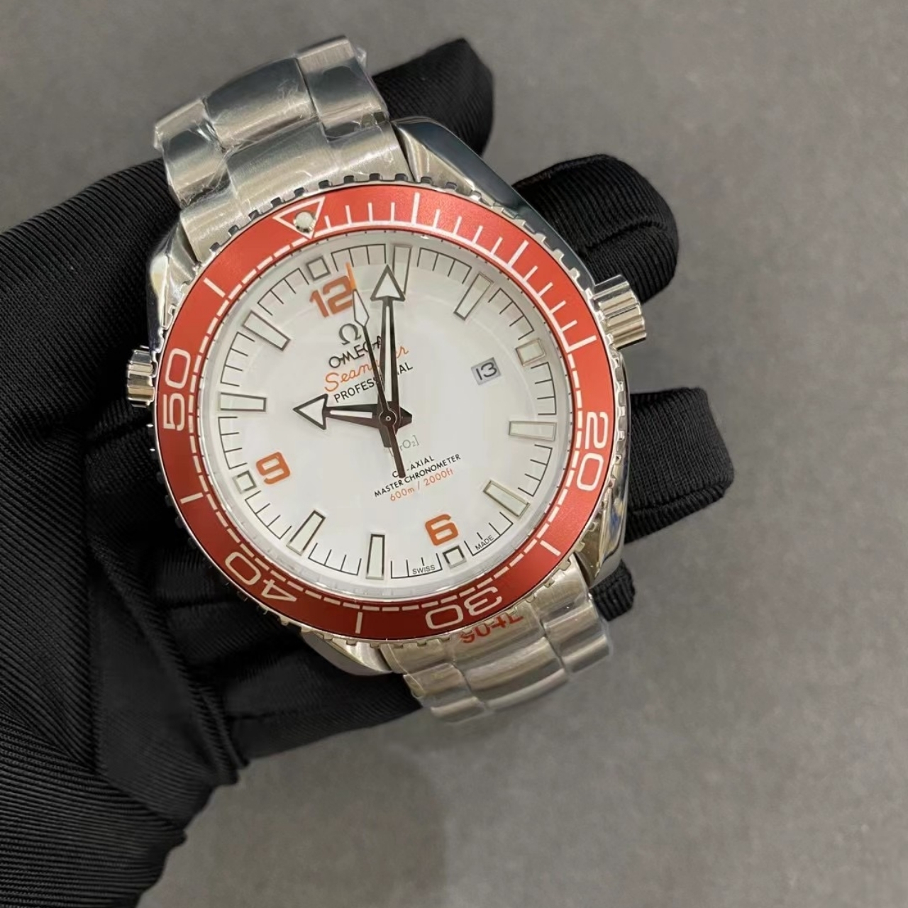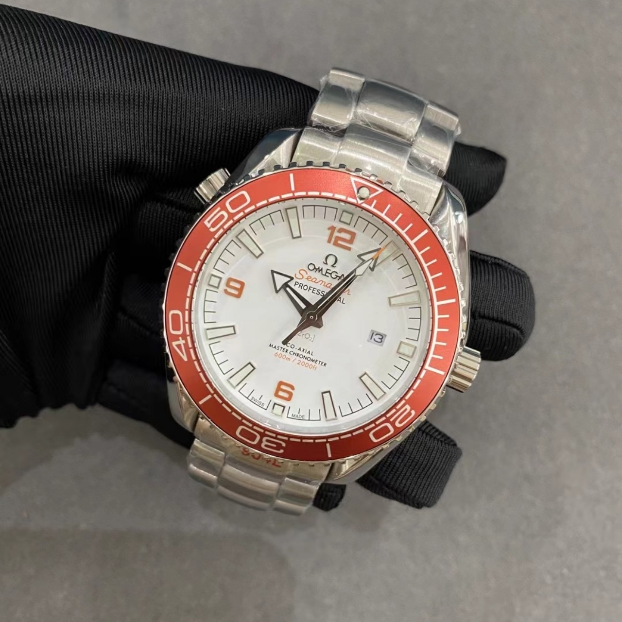 The Omega Seamaster Planet Ocean 600M features a bold design with a striking white dial and an orange bezel. The stainless steel case and bracelet ensure durability while maintaining a sporty, eye-catching look.
