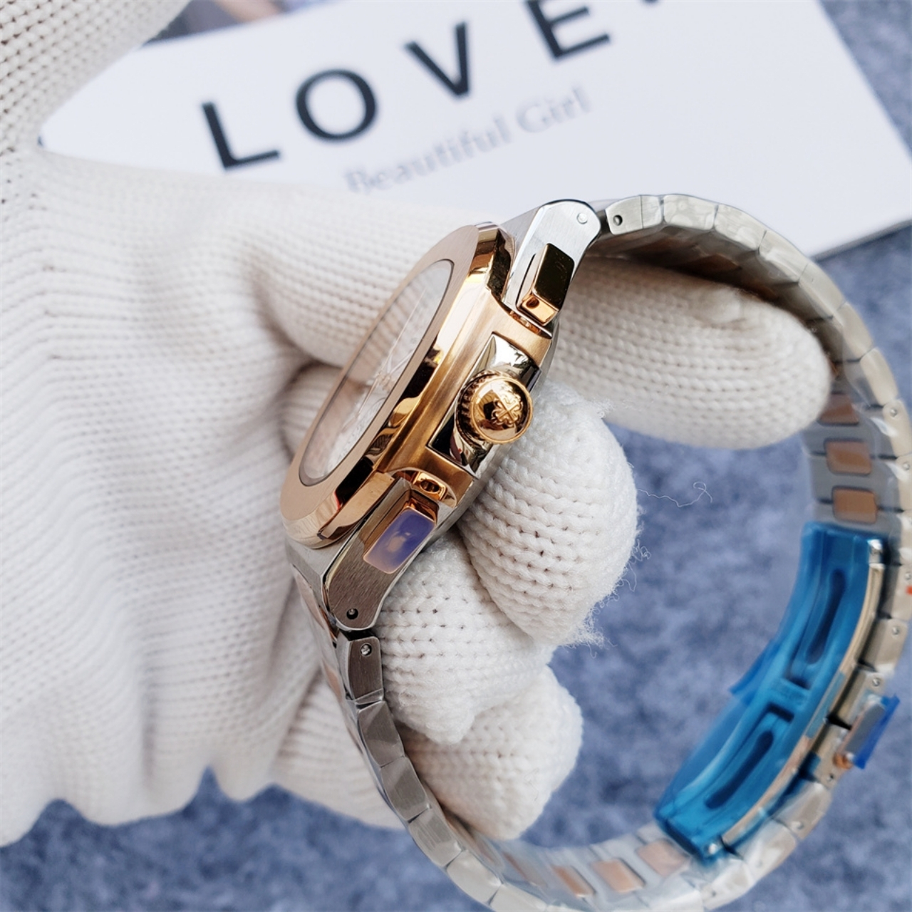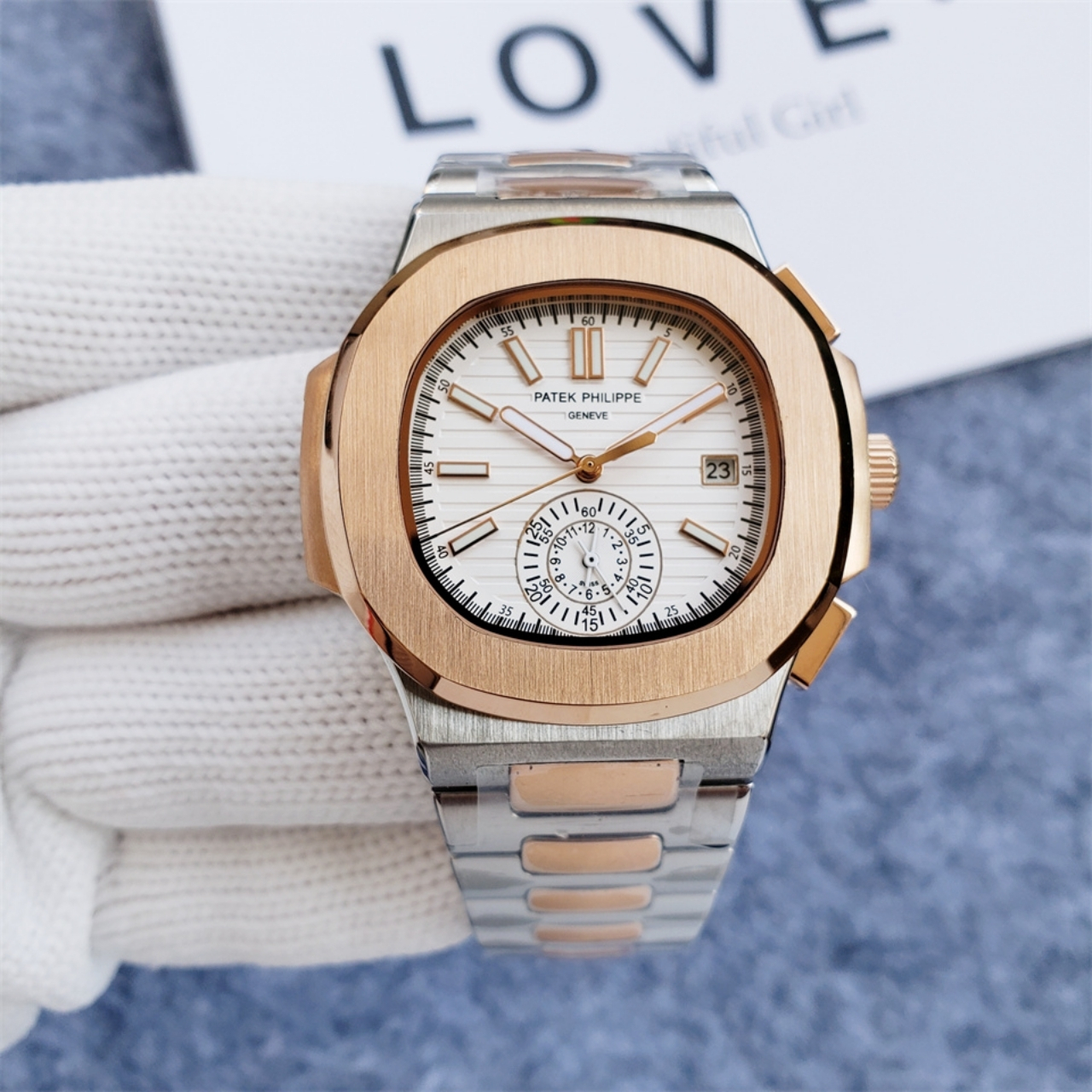 The Patek Philippe Nautilus Chronograph combines sportiness with refined elegance. It features a white dial with horizontal embossing, a date window at 3 o’clock. The two-tone design in stainless steel and rose gold enhances its luxurious appeal, complemented by a matching bracelet.